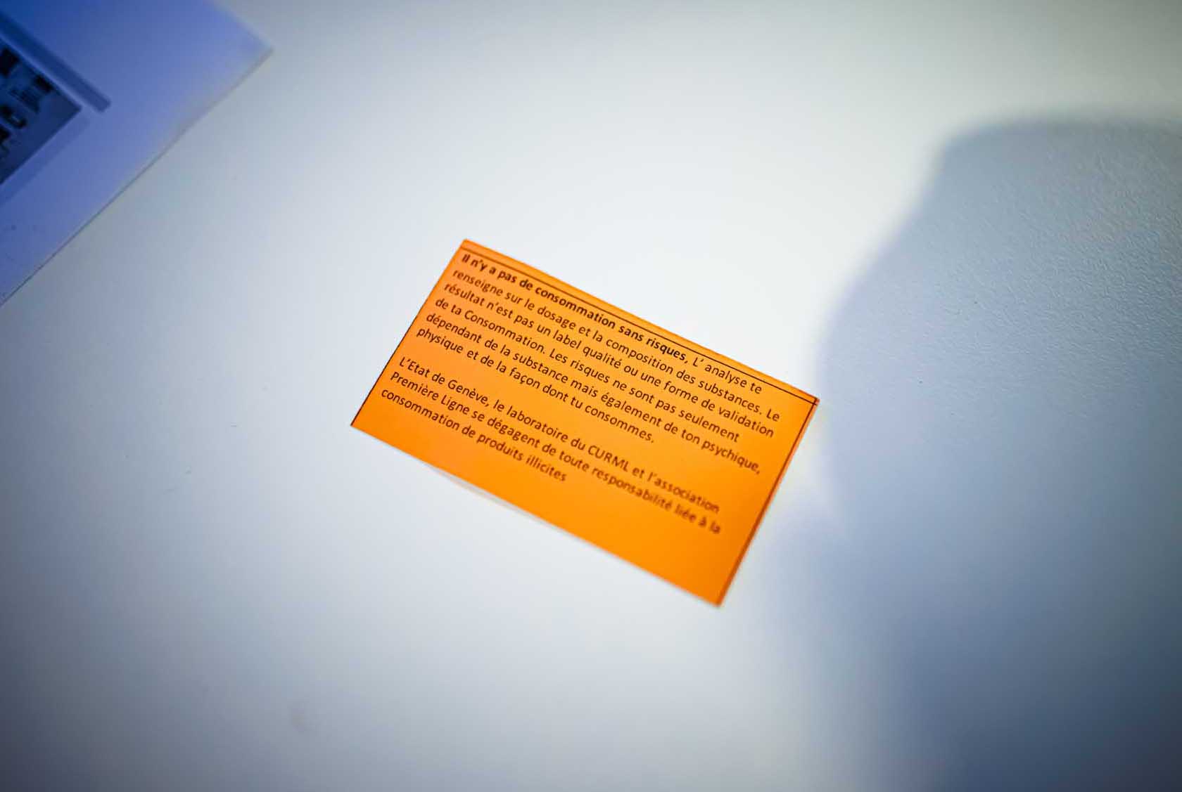 16h15. L’entretien peut commencer. Par un disclaimer. L’intervenant lit une petite carte orange. «Je dois te dire qu’il n’y a pas de consommation sans risques. L’analyse te renseigne sur le dosage et la composition des substances. Le résultat n’est pas un label de qualité ou une forme de validation de ta consommation. Les risques ne sont pas seulement dépendants de la substance, mais également de ton état psychique et physique, et de la façon dont tu consommes.»