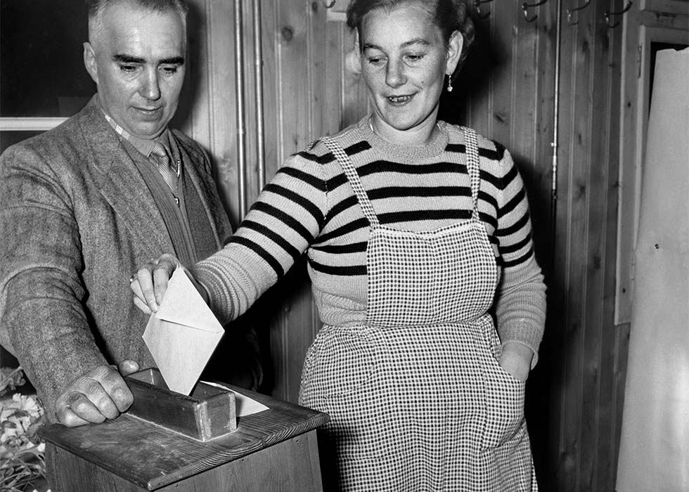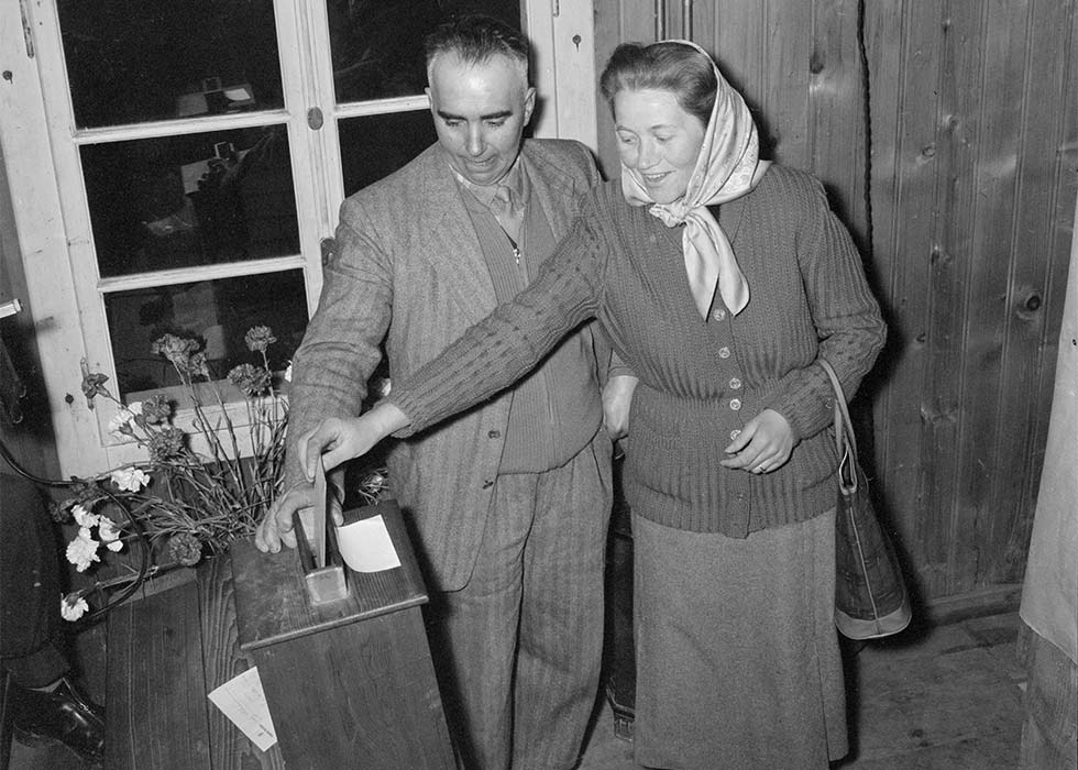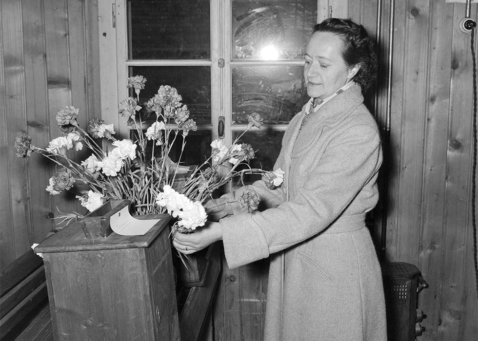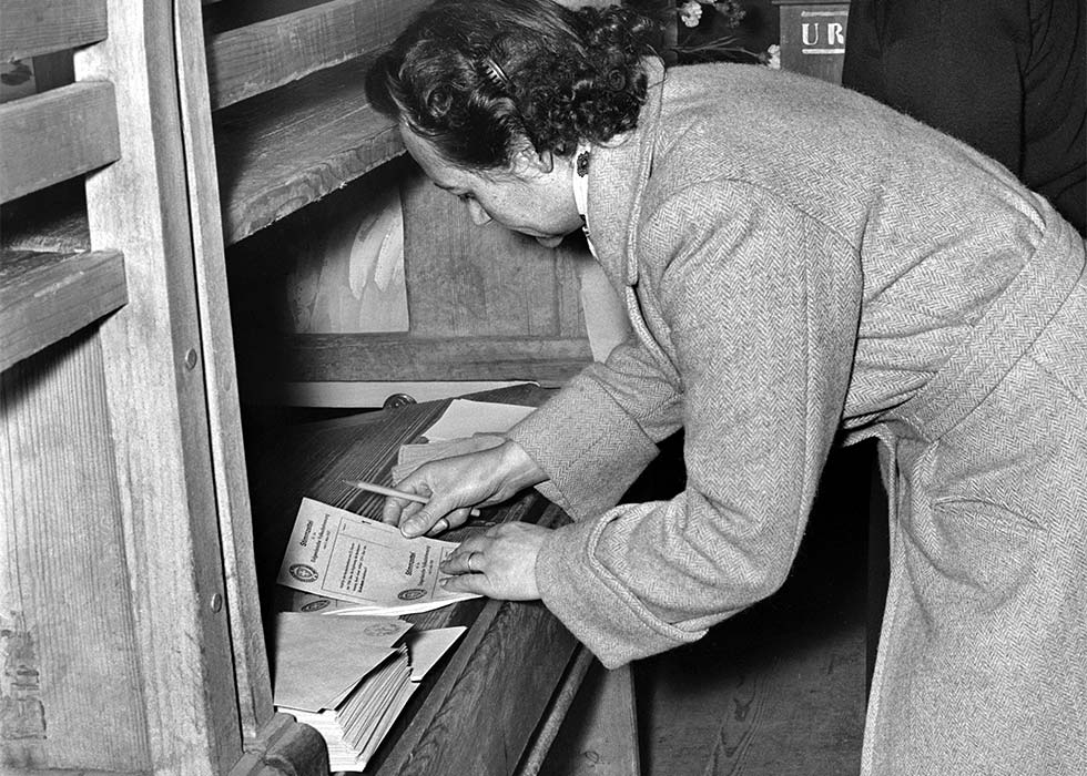 Mit Blumen an die Urne: Katharina Zenhäusern im Wahllokal am 3. März 1957.