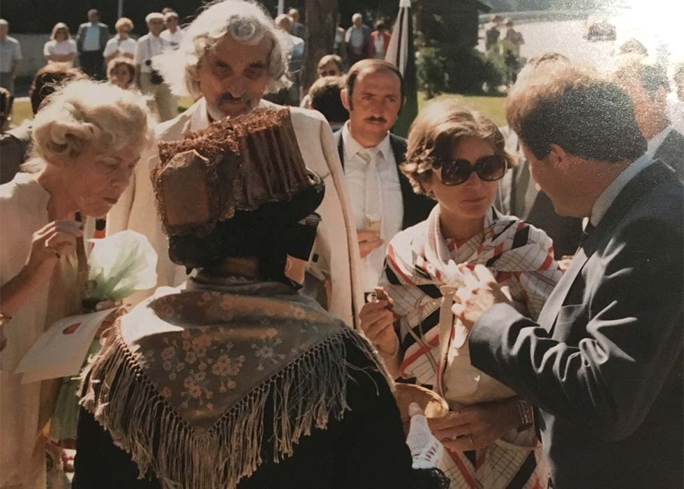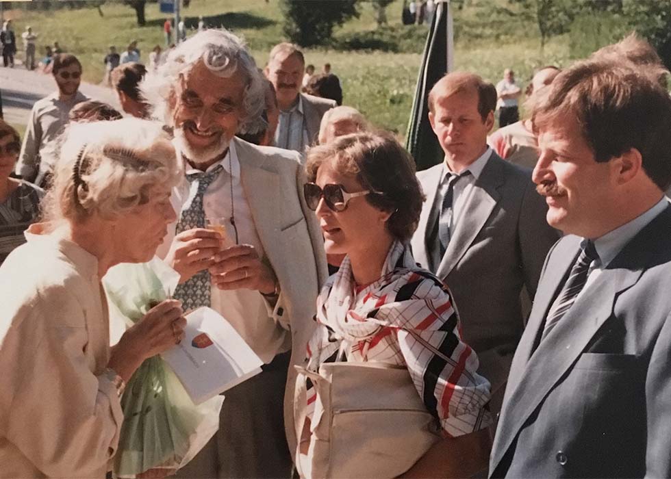 Iris von Roten, Peter von Roten, Elisabeth Kopp, Roman von Weissen (v.l.n.r.) 1984 in Unterbäch.