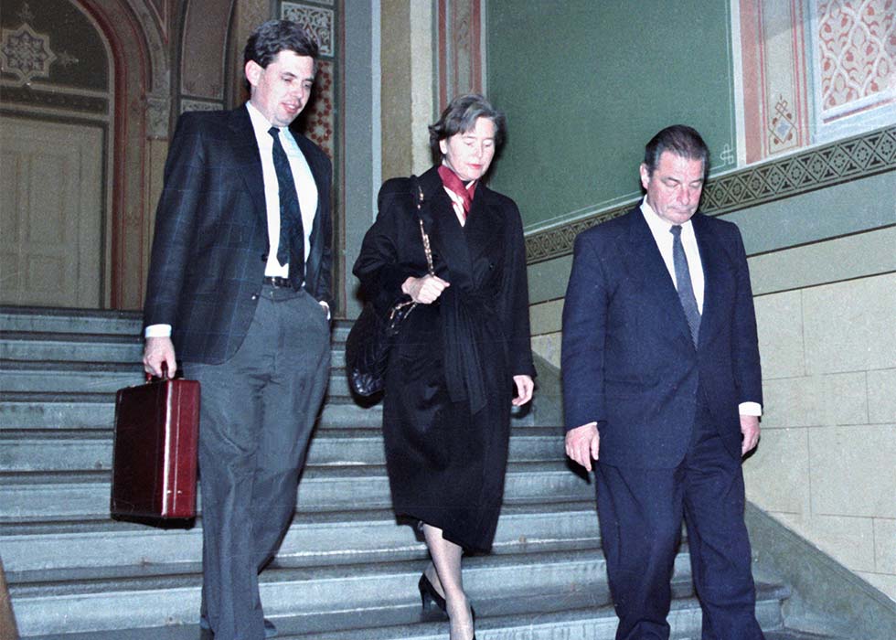 Abgang nach dem Rücktritt: Elisabeth Kopp mit Parteikollege und Bundesrat Jean-Pascal Delamuraz.